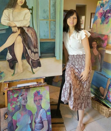 Gabriela "Gaby" Hogue is an Ecuadorian-born artist based in Hot Springs Village, Arkansas. Her work explores the depth and complexity of the feminine spirit through figurative paintings with abstract elements. Working in acrylics and oils, she creates serene, stylized portraits of women that invite reflection, stillness, and emotional presence.